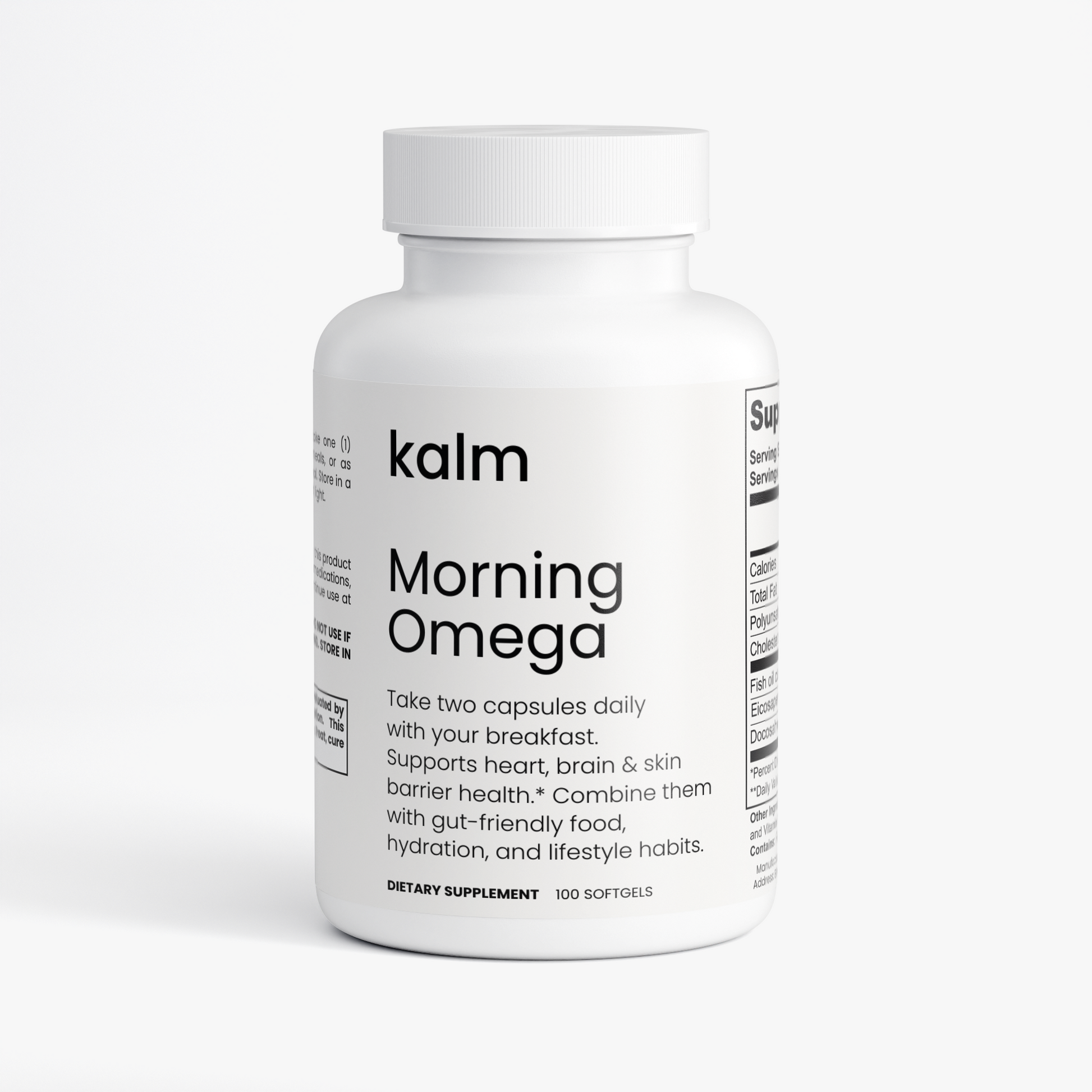 Our Morning Omega provides EPA and DHA, two essential fatty acids that help reduce inflammation in the body — a key factor for eczema. Omega-3s support a healthy skin barrier, calmer skin, and balanced immune responses. They also contribute to heart, brain, and overall wellness.